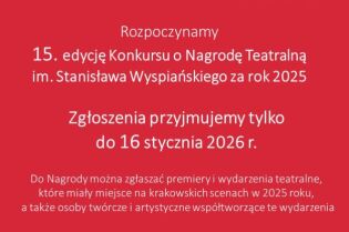 Już po raz piętnasty zostanie w tym roku przyznana Nagroda Teatralna im. Stanisława Wyspiańskiego. Nabór wniosków trwa do 16 stycznia 2026 r.