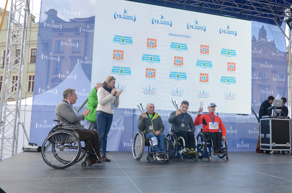Najszybszym maratończykiem na wózku inwalidzkim typu handbike z czasem 37:35 okazał się Rafał Wilk ze Stali Rzeszów.
