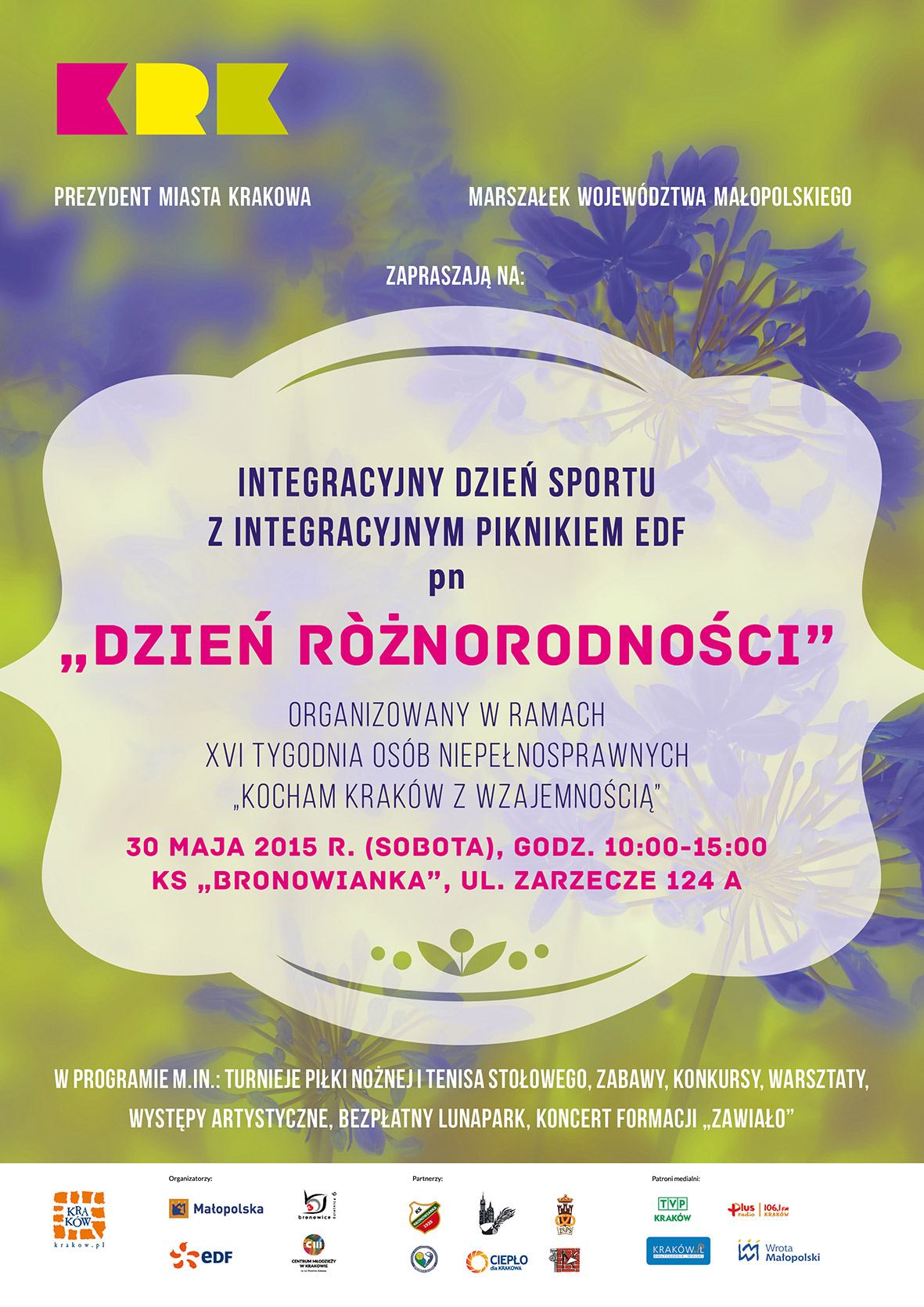 Zapraszamy od 29.05 do 05.06. 2015 roku. Startujemy jak zwykle na Rynku Głównym w Krakowie o godz. 10.00. Występom artystycznym na scenie towarzyszyć będzie prezentacja prac plastycznych osób niepełnosprawnych, sesja zdjęciowa w strojach bajkowych, prezentacja Kultury Głuchych, plener malarski i rywalizacja w wioślarstwie halowym. wystąpią zespoły:YeskiezSirumen, Prokoncepcja, Anna Zeber i Jerzy Michał Bożyk. Gwiazdą wieczoru będzie Jacek Wójcicki.