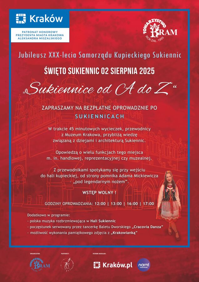 Pod patronatem PrezydentaŚwięto 30-lecia Samorządu Kupieckiego w Sukiennicach - Święto Sukiennic w 2025 r. Informacja archiwalna Święto 30-lecia Samorządu Kupieckiego w Sukiennicach - Święto Sukiennic w 2025 r. Termin: 2025 r. Organizator: Towarzystwo KRAM pokaż metkę Autor: MAŁGORZATA JURCZYK