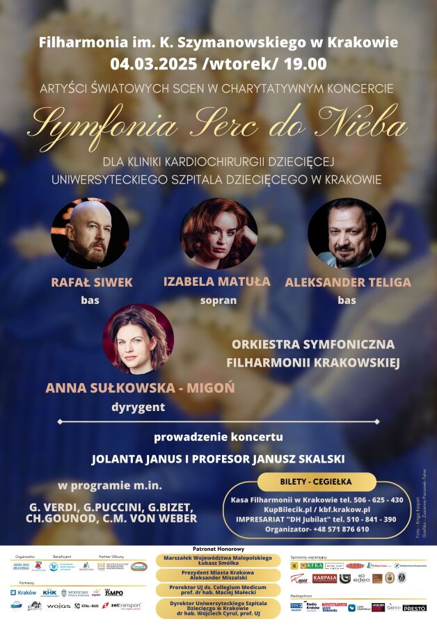Artyści największych scen operowych: Izabela Matuła, Rafał Siwek, Aleksander Teliga i wschodząca gwiazda światowej dyrygentury Anna Sułkowska-Migoń spotkają się po raz pierwszy razem na scenie Filharmonii Krakowskiej 4 marca 2025 o godzinie 19.00. Wystąpią w szczytnym charytatywnym celu, w koncercie „Symfonia Serc do Nieba” dedykowanym dzieciom z wadami serca.