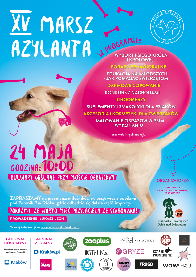 Już 24 maja o godzinie 10.00 zapraszamy wszystkie adopciaki na XV Marsz Azylanta - wydarzenie organizowane przez Krakowskie Towarzystwo Opieki nad Zwierzętami!