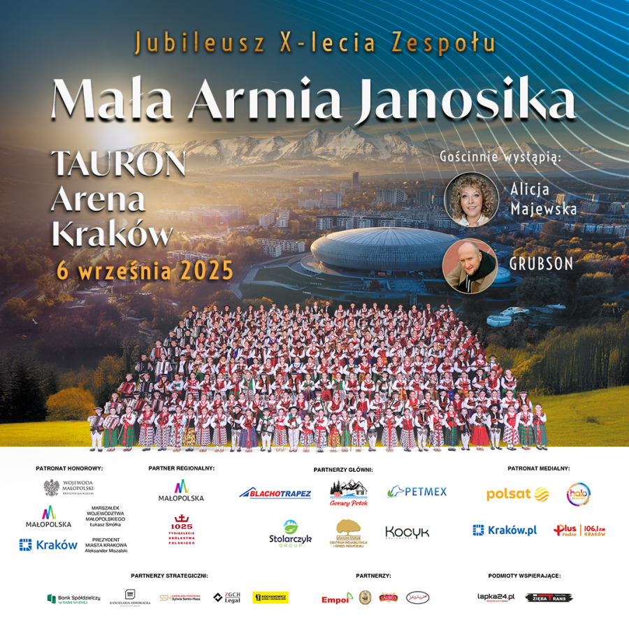 Spotkanie tradycji z nowoczesnością, góralskiej energii z hip-hopowym flow i klasyki z młodzieńczą ekspresją – tak zapowiada się jubileuszowy koncert Małej Armii Janosika, który odbędzie się już 6 września w TAURON Arenie Kraków. Największa góralska kapela w Polsce świętuje swoje 10-lecie z rozmachem – na scenie obok ponad 300-osobowego zespołu pojawią się Alicja Majewska oraz Grubson. Bilety dostępne są na stronie www.eventim.pl.