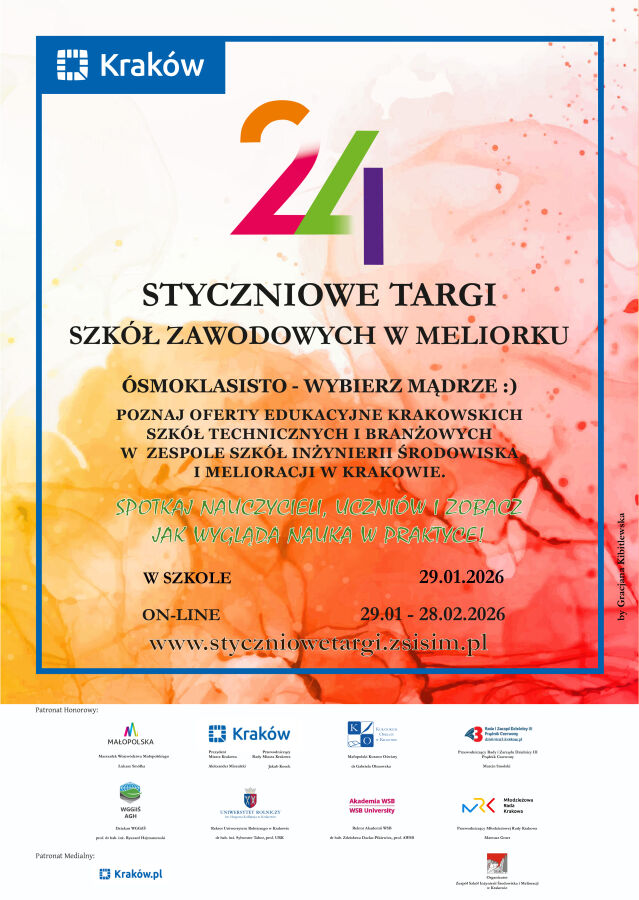 29 stycznia 2026 r. na terenie Zespołu Szkół Inżynierii Środowiska i Melioracji w Krakowie przy ul. Ułanów 9, a także od 29 stycznia 2026 r. do 28 lutego 2026 r. na stronie internetowej styczniowetargi.zsisim.pl odbędą się XXIV „Styczniowe Targi Szkół Zawodowych w Meliorku” – impreza o charakterze edukacyjno-wychowawczym przygotowana w szczególności z myślą o uczniach klas ósmych szkół podstawowych, ich rodzicach oraz nauczycielach.