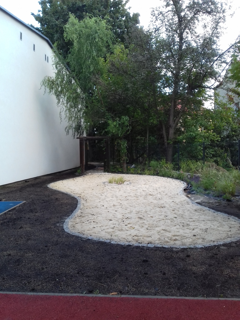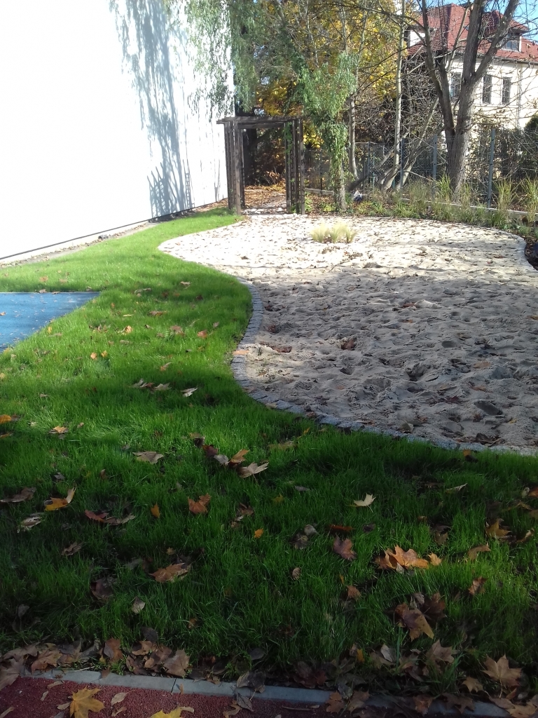 – Otoczenie piątego odcinka obsadziliśmy wysokimi trawami, które poruszane wiatrem, będą delikatnie szumieć, a gdy się rozrosną, stworzą ścianę izolującą od hałasu ulicy i sąsiedniego osiedla. Są też pergola i trejaż, ich pnącza stworzą tunel ciszy. Nawierzchnia składa się z różnego rodzaju podłoża, m.in. kostki brukowej, gdzie tworzy garb, jak na niektórych krakowskich ulicach. Mamy też wielkie otoczaki zalane betonem – opisuje Agnieszka Rzehak z Fundacji Edukacyjnej Dialog. – Z kostek powstał wizerunek jaszczurki. Dzieci nazwały ją zwinką tyniecką. Do pełni szczęścia brakuje nam jeszcze urządzeń wspierających trening orientacji przestrzennej – dodaje.