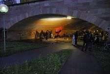 Autobus artystyczny Piotra Lutyńskiego przyjechał z Krakowa, wzbudzając po drodze powszechne zainteresowanie. Autobus Projekt "Autobus KR 736EJ" swoją genezą sięga wozu teatralnego, kina objazdowego, muzycznego taboru i rzeczywiście, niezwykły pojazd jest ruchomą galerią sztuki, sceną koncertową i kinem w jednym. W Norymberdze artyści zagrali w kilku miejscach żywiołowe koncerty na dachu swojego barwnego pojazdu (między innymi na pikniku artystycznym na Leonhardplatz, a także w samym sercu miasta pod kościołem św. Wawrzyńca), by w końcu dotrzeć do „miejsca przeznaczenia", gdzie odbył się festyn Domu Krakowskiego. Tam czekał już Ulrich Lepka, z zaaranżowanym pod mostem wędrownym barem i swoim przenośnym stołem didżejskim. Dowcipna aranżacja, obfitująca w taśmy z frędzlami, jelenie poroża, meble zbite z europalet i beczki-koksowniki z płonącym w nich drewnem zamieniła przestrzeń pod mostem w przytulne „schronienie dla włóczęgów". Konwencja spotkania dwóch grup wagabundów, pod mostem, w atmosferze cyganerii okazała się nie tylko zabawna i oryginalna, ale także zbawienna - gdyż nieustający ulewny deszcz uniemożliwiłby odbycie festynu letniego w tradycyjnej formie. Jednak dzięki ogromnemu gościnnemu sklepieniu mostu nic nie stało na przeszkodzie, by spędzić dwa długie wieczory w towarzystwie artystów na zmianę grających na żywo ogniste koncerty (grupa krakowska) lub odtwarzających bałkańskie rytmy z płyt (frakcja norymberska). W oknach moknącego na deszczu autobusu, zaparkowanego u wylotu mostu, odbywały sie projekcje psychodelicznych wideo z pływającymi rybami, zamieniając autobus w ogromne akwarium. W ten weekend wiele festynów odbywających się w kilku punktach Norymbergi zakończyło się jeszcze przed rozpoczęciem, w strugach deszczu. Dzięki oryginalnemu pomysłowi festynu pod mostem impreza odbyła się mimo ulewy.