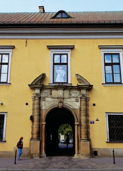 Karol Wojtyła zamieszkał tu 10 sierpnia 1944 r. jako student konspiracyjnego Seminarium Duchownego Archidiecezji Krakowskiej. święcenia kapłańskie przyjął 1 listopada 1946 r. z rąk Księcia kard. Adama Stefana Sapiehy w jego prywatnej kaplicy. W tutejszej Kurii Metropolitalnej od 1958 r. ks. Karol Wojtyła pełnił posługę biskupa, a potem - metropolity krakowskiego aż do 16 października 1978 r. - dnia wyboru na Stolicę Apostolską. Ojciec święty Jan Paweł II mieszkał w tym Pałacu podczas każdej z pielgrzymek do Krakowa. Nad wejściem znajduje się sławne okno, z którego Ojciec święty pozdrawiał przybyłą na spotkania z Nim młodzież Krakowa. Na dziedzińcu Pałacu stoi pomnik Jana Pawła II, dar i dzieło Jole Sensi Croci, odsłonięty w maju 1980 r.