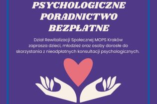 Dział Rewitalizacji Społecznej MOPS w Krakowie informuje, że dzieci, młodzież oraz osoby dorosłe mogą skorzystać z nieodpłatnego wsparcia psychologicznego.