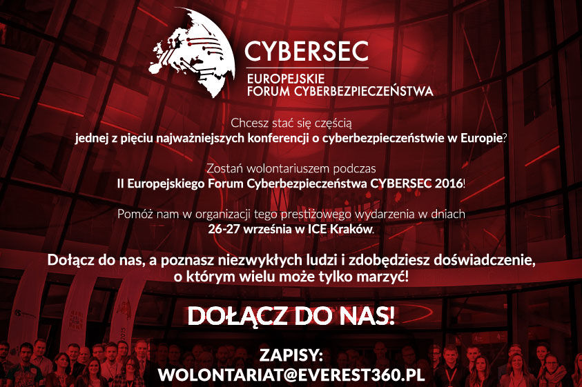 W dniach 26-27 września w Krakowie odbędzie się druga edycja Europejskiego Forum Cyberbezpieczeństwa, corocznej konferencji poświęconej strategicznym aspektom bezpieczeństwa cyberprzestrzeni. W ramach CYBERSEC wypracowywane są praktyczne rekomendacje, mające na celu bardziej efektywną walkę z cyberzagrożeniami, zarówno na poziomie globalnym, jak i lokalnym. Organizatorzy wydarzenia poszukują wolontariuszy chętnych do wzięcia udziału w projekcie!