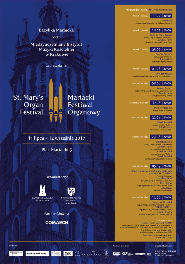 Serdecznie zapraszamy mieszkańców oraz gości Krakowa do bazyliki Mariackiej na III Mariacki Festiwal Organowy. Przez dwa letnie miesiące sławną krakowską Bazylikę, znaną przede wszystkim z ołtarza Wita Stwosza oraz hejnału mariackiego, wypełnią dźwięki królewskiego instrumentu w wykonaniu wirtuozów muzyki organowej m.in.: Jennifer Pascual – dyr. muzyczny katedry św. Patryka na Manhattanie, Ernst Wally – tytularny organista katedry św. Stefana w Wiedniu, Eugenio Maria Fagiani z Włoch, Brice Montagnoux z Francji oraz Roman Perucki – I organista katedry oliwskiej. 5 września, w koncercie upamiętniającym 500-lecie reformacji wystąpi natomiast organista Peter Kofler z katedry w Monachium.