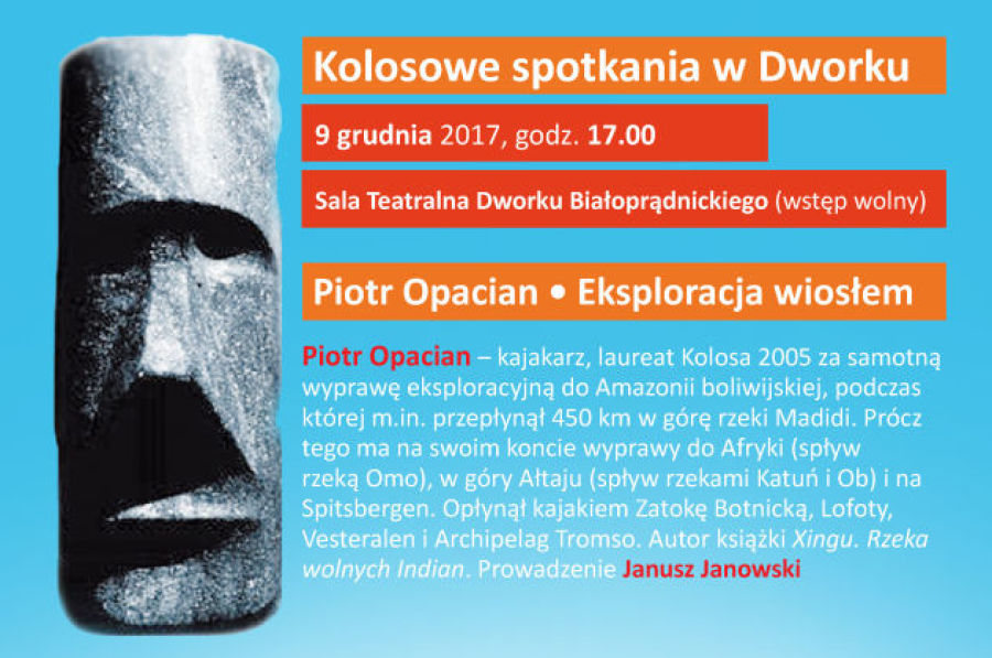 Jako środek lokomocji wybrał sobie wszystko, co pływa, pod warunkiem, że jest napędzane wiosłem. Od lat przemierza różne kontynenty w poszukiwaniu przygód i nieskażonej, dzikiej przyrody. Samotnie przepłynął kajakiem rzeki Rio Madidi i Beni znajdujące się w słabo poznanej Amazonii boliwijskiej – łącznie 1800 km, w tym 450 km pod prąd. Otrzymał za to statuetkę Kolosa 2005. Musicie poznać Piotra Opaciana! Dzisiaj będzie gościem spotkania w Dworku Białoprądnickim – początek o godz. 17.00 w sali teatralnej, ul. Papiernicza 2.