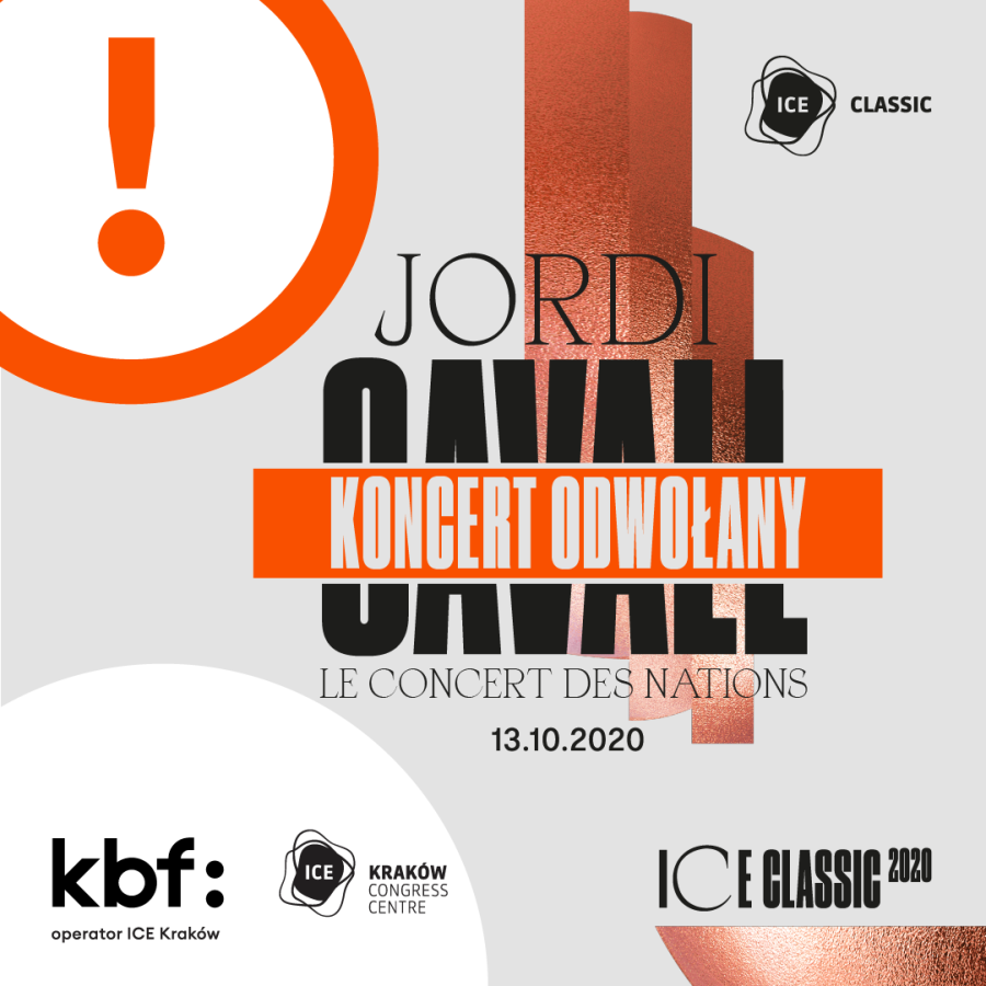 Krakowskie Biuro Festiwalowe podjęło decyzję o odwołaniu koncertu z cyklu ICE Classic: Jordi Savalla w pierwotnie planowanej formule. Koncert, który był zaplanowany na 13 października w Centrum Kongresowym ICE Kraków, zostanie zarejestrowany bez udziału publiczności, a następnie udostępniony szerokiemu gronu odbiorców za pośrednictwem platformy PLAY KRAKÓW.