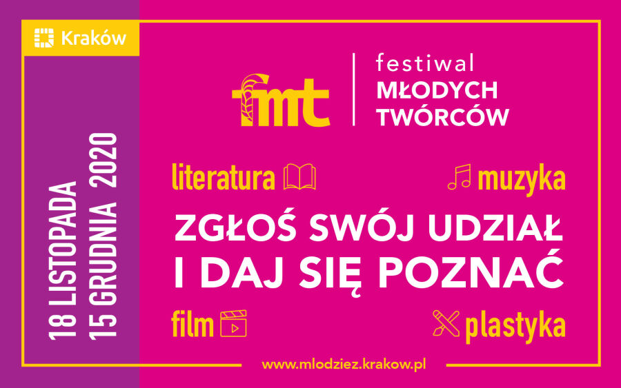 Zgłoszenia do Festiwalu Młodych Twórców zbierane są do 30 października. Więcej informacji, a także regulamin oraz formularz zgłoszeniowy można znaleźć na specjalnej odsłonie strony miasta skierowanej do młodzieży – Młody Kraków.