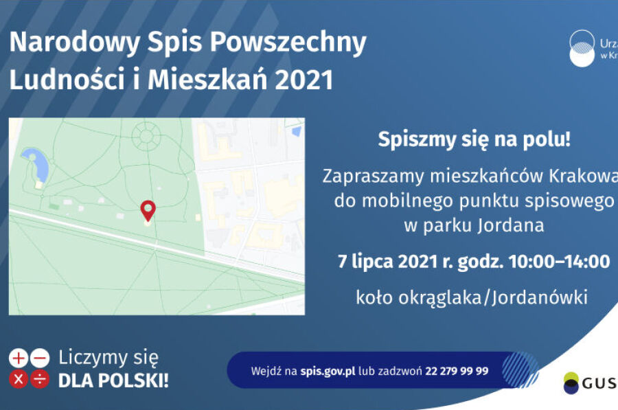 W najbliższą środę, 7 lipca, zapraszamy mieszkańców Krakowa do Mobilnego Punktu Spisowego zlokalizowanego w Parku im. Henryka Jordana w Krakowie (koło okrąglaka/Jordanówki). W godzinach 10.00-14.00, z pomocą pracowników Wojewódzkiego Biura Spisowego w Krakowie, będzie można dokonać samospisu oraz uzyskać dodatkowe informacje na temat trwającego spisu.