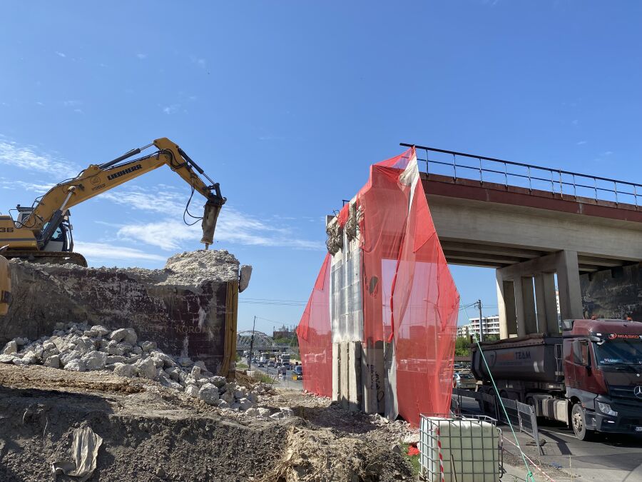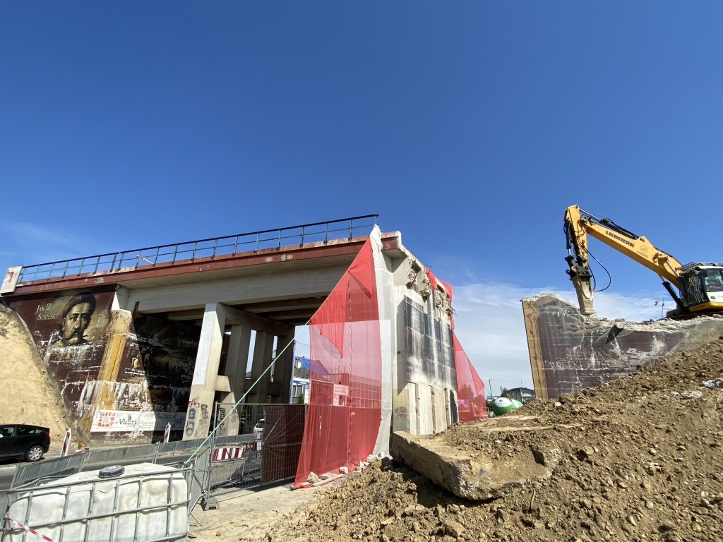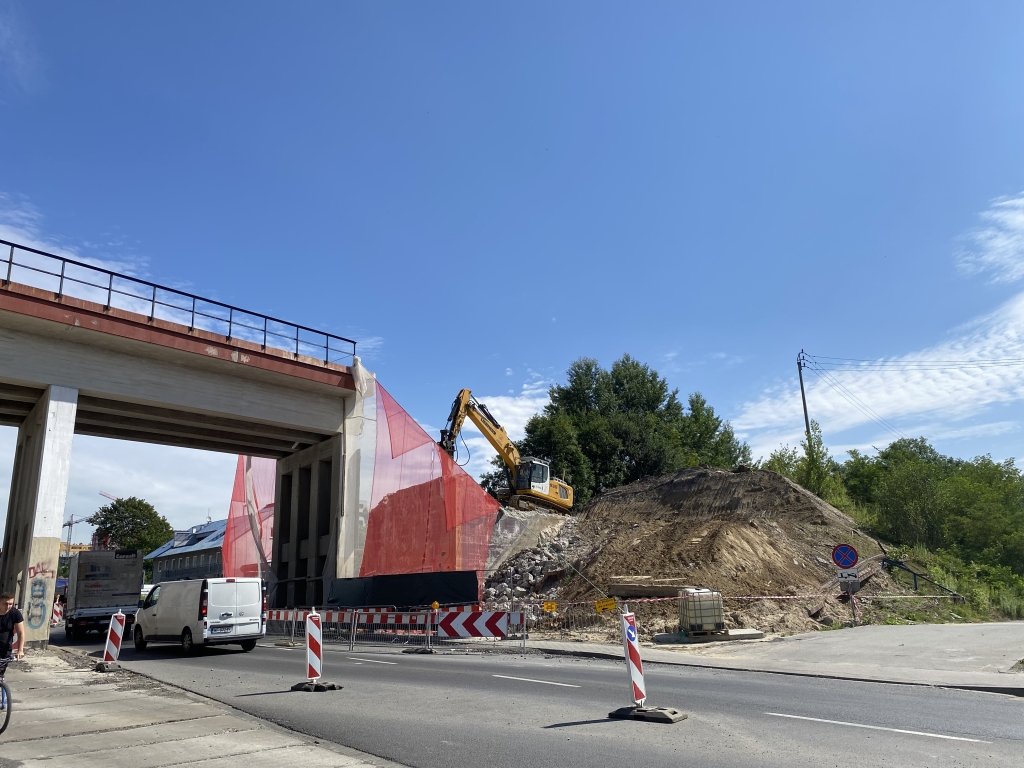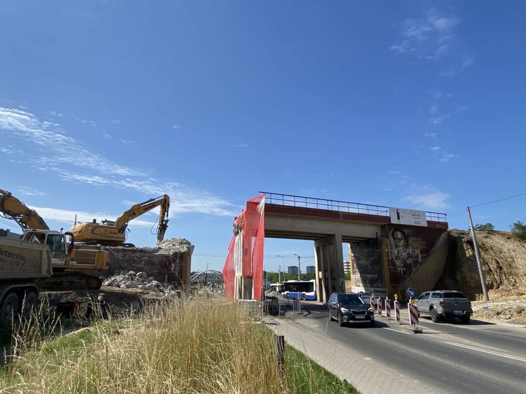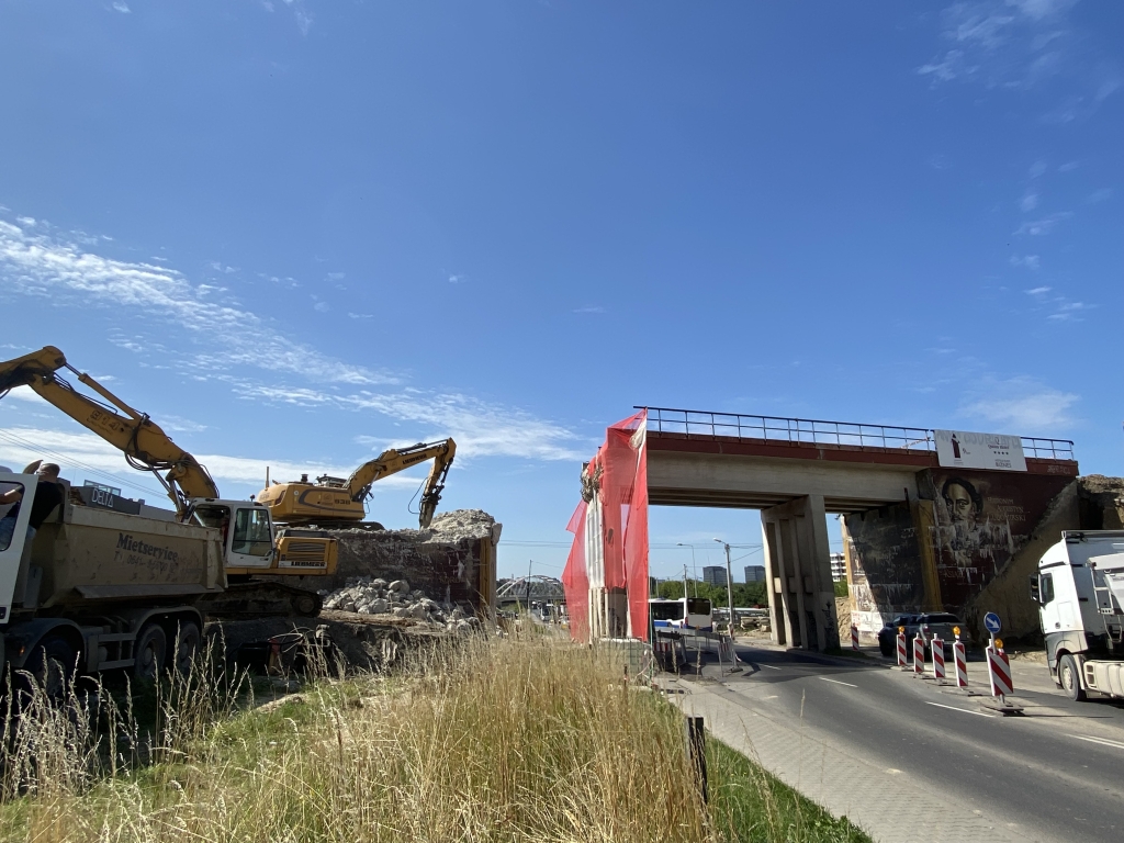Trwa wyburzanie wiaduktu kolejowego w rejonie ul. Kuźnicy Kołłątajowskiej. Sukcesywnie usuwana jest stara betonowa konstrukcja. Ruch samochodowy odbywa się dwoma pasami. Piesi mogą korzystać ze specjalnie przygotowanego dla nich korytarza.