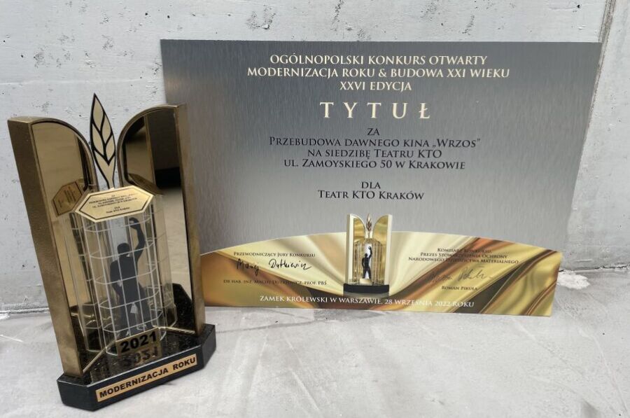Nowa siedziba Teatru KTO przy ul. Zamoyskiego 50 na krakowskim Podgórzu została nagrodzona w prestiżowym konkursie branżowym „Modernizacja Roku & Budowa XXI w.”. Podczas Gali, która odbyła się w Warszawie teatr otrzymał Tytuł Modernizacja Roku 2021 w kategorii „Pamięć miejsc historycznych”.