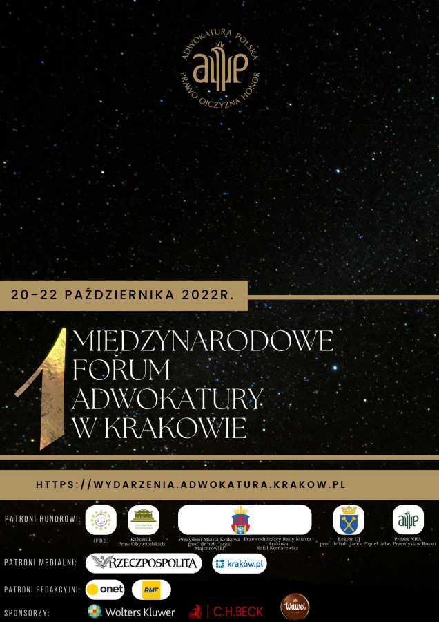 W dniach od 20 do 22 października odbędzie I Międzynarodowe Forum Adwokatury w Krakowie pod patronatem honorowym Przewodniczącego Rady Miasta Krakowa Rafała Komarewicza.