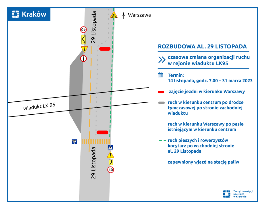 Od 14 listopada została wprowadzona czasowa zmiana organizacji ruchu na al. 29 Listopada, w rejonie przebudowywanego wiaduktu na linii kolejowej nr 95 przy ul. Kuźnicy Kołłątajowskiej.