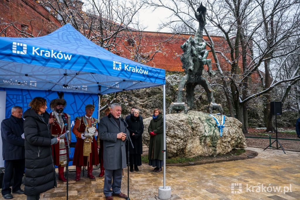 − Umieszczenie tabliczki przypominającej o autorze Smoka Wawelskiego, rzeźby tak ważnej dla miasta, lubianej przez krakowian i gości, jest symbolicznym finałem jubileuszu. W tym roku, podczas wielu różnorodnych wydarzeń, Kraków świętował „smocze urodziny”. W centrum wszystkich inicjatyw znajdował się właśnie Smok Wawelski, którego dziś wyobrażamy sobie w postaci, jaką nadał mu profesor Bronisław Chromy, krakowski artysta i rzeźbiarz. Charakterystyczną twórczość artysty znajdziemy w wielu punktach miasta. Zachęcam do odwiedzania smoka, a także spacerów po mieście szlakiem rzeźb profesora i odwiedzania jego autorskiej galerii w parku Decjusza − mówi prezydent Krakowa Jacek Majchrowski, który wziął udział w odsłonięciu tabliczki poświęconej Bronisławowi Chromemu.
