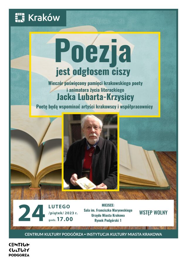 Dziś, 24 lutego, o godz. 17.00 w Urzędzie Miasta Krakowa, przy Rynku Podgórskim 1 (Sala im. Franciszka Maryewskiego) odbędzie się wieczór poświęcony pamięci Jacka Lubarta-Krzysicy zatytułowany „Poezja jest odgłosem ciszy”. Wstęp wolny.