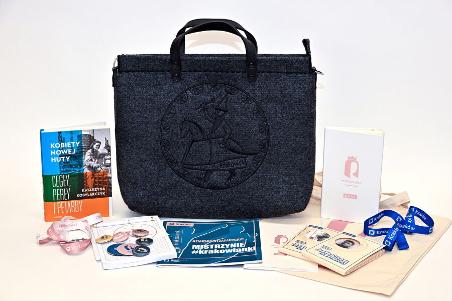 Z okazji wystawy przygotowaliśmy konkurs dla naszych czytelniczek i czytelników. Mamy dla Was pięć zestawów nagród, składających się z pakietu gadżetów „Miesiąca Krakowianek”, książki „Kobiety Nowej Huty: cegły, perły i petardy” i pakownej, eleganckiej torby z Lajkonikiem!