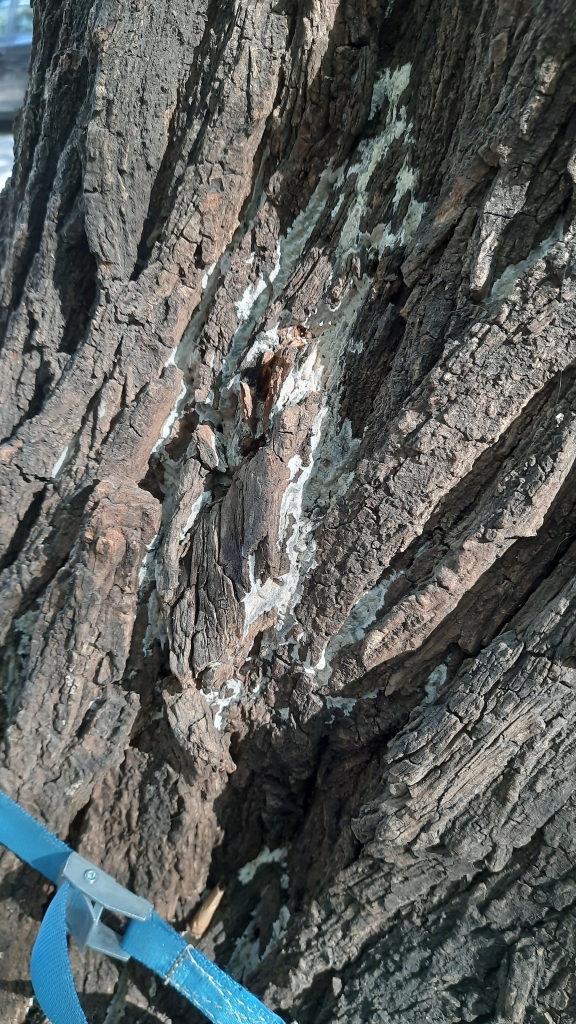W szczelinach pnia, na korzeniach i na jednej z narośli na wysokości 3m – widoczny biały nalot pochodzenia grzybowego.