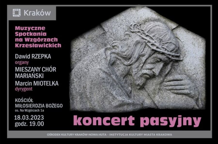Dziś o godz. 19.00 w kościele Miłosierdzia Bożego na Wzgórzach Krzesławickich odbędzie się Koncert Pasyjny w ramach cyklu Muzyczne Spotkania na Wzgórzach Krzesławickich organizowanego przez Ośrodek Kultury Kraków-Nowa Huta. Usłyszymy arcydzieła muzyki pasyjnej od renesansu do współczesności, w wykonaniu organisty Dawida Rzepki oraz Mieszanego Chóru Mariańskiego.