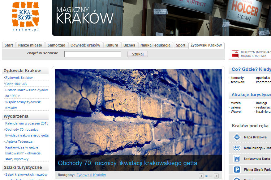 Nowa zakładka zawiera również kalendarium tematycznych wydarzeń kulturalnych, edukacyjnych i rozrywkowych na 2013 rok oraz przewodnik po najważniejszych zakątkach i zabytkach dzielnicy Kazimierz, związanych z żydowską historią.