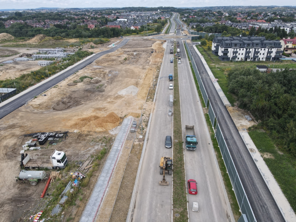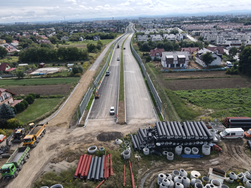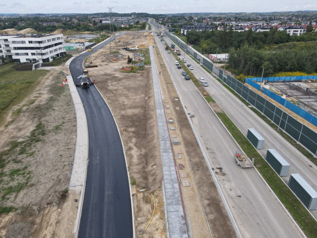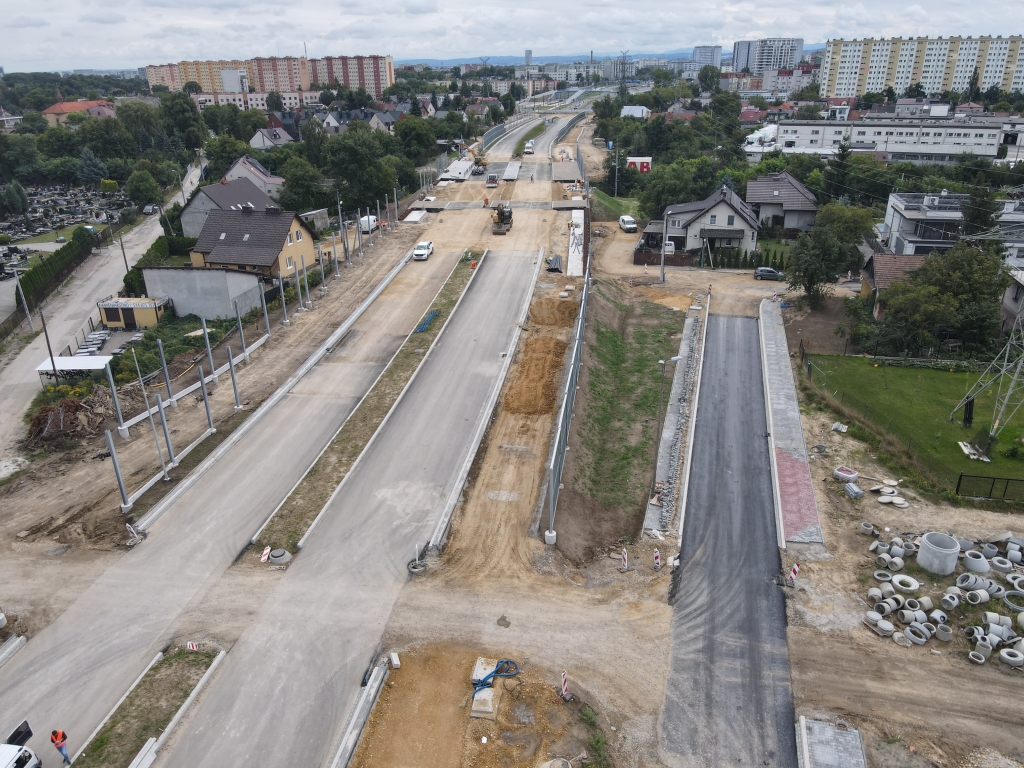 Obecnie układane są kolejne masy bitumiczne zarówno na jezdniach, jak i na wiadukcie nad linią kolejową. Widać już także rondo turbinowe, za pomocą którego będzie można zjechać z trasy w kierunku ul. Glogera. Warto dodać, że nowej trasie będzie towarzyszyć droga dla rowerów o długości blisko 2 km.