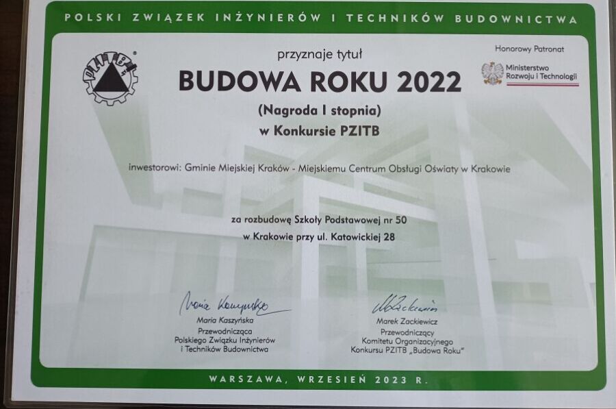Rozbudowa Szkoły Podstawowej nr 50 przy ul. Katowickiej, zrealizowana przez Miejskie Centrum Obsługi Oświaty w Krakowie, zdobyła prestiżową nagrodę w XXXIII Konkursie Budowa Roku 2022, organizowanym przez Polski Związek Inżynierów i Techników Budownictwa w Warszawie.