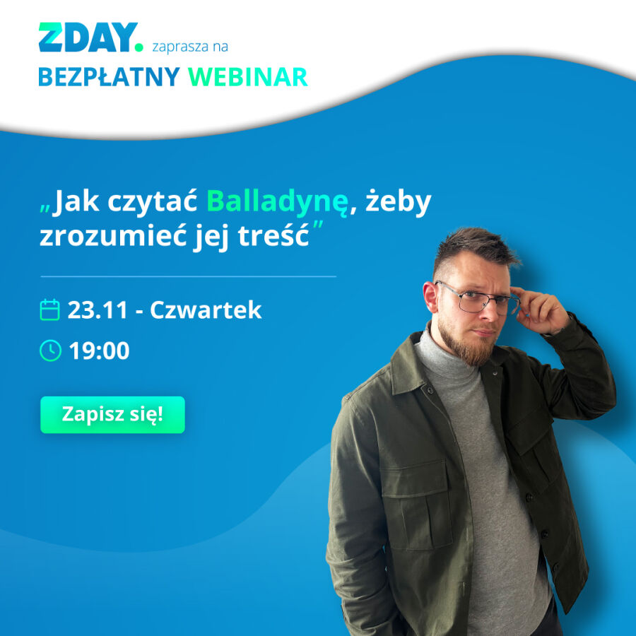 Jak czytać Balladynę, aby lepiej zrozumieć przesłanie tej lektury? To temat przewodni najbliższego webinaru organizowanego przez twórców aplikacji ZDAY. Marek Lepczak, w roli prowadzącego podpowie również, jak skutecznie przygotować się do egzaminu ósmoklasisty i jak czytanie ze zrozumieniem pozwoli zdobyć dodatkowe punkty.