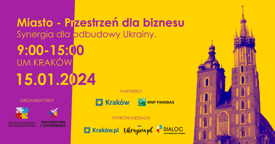 Dziś, 15 stycznia, w sali Obrad Urzędu Miasta Krakowa odbywa się konferencja „Miasto – przestrzeń dla biznesu. Synergia dla odbudowy Ukrainy” organizowana przez Polsko-Ukraińską Izbę Gospodarczą w ramach kampanii społecznej „Partnerstwo i Zatrudnienie” i projektu „Praca dla odbudowy ukraińskiej przedsiębiorczości”.