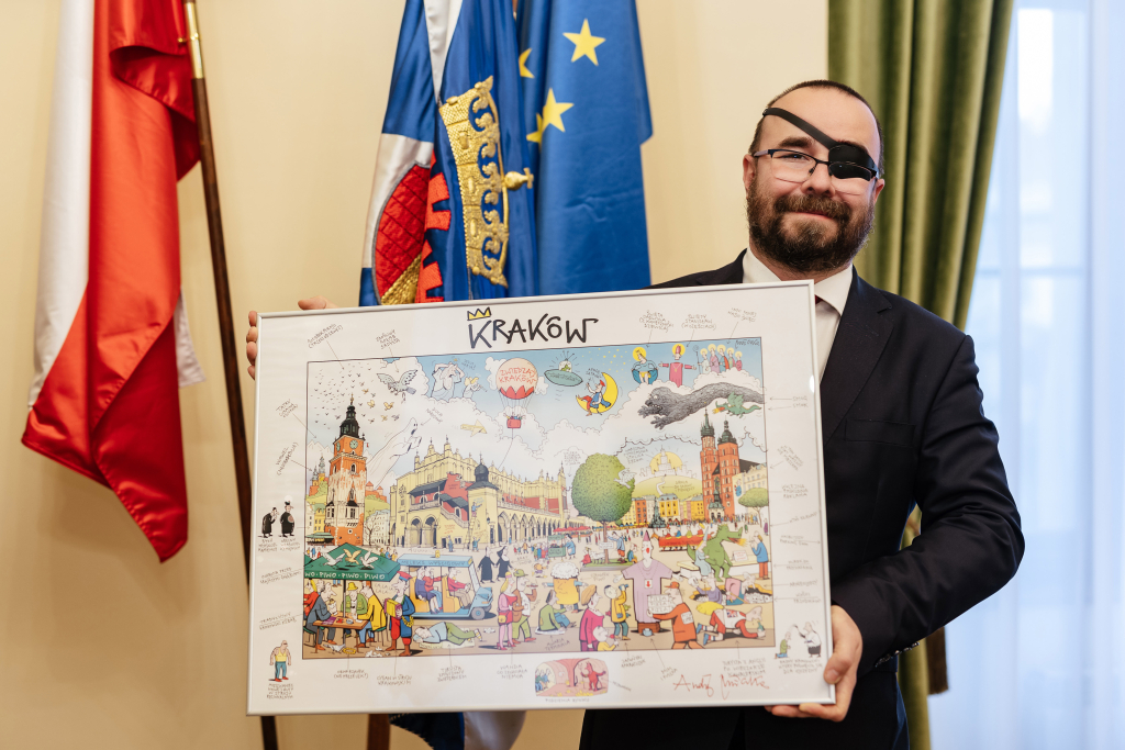 Plakat Kraków autorstwa Honorowego Obywatela Miasta Krakowa za autografem może należeć do Ciebie. Krakowski Rynek to serce i dusza naszego miasta, to właśnie tutaj rozpoczęło się wiele opowieści, powstało tyle ciekawych historii i działo się mnóstwo niezwykłych wydarzeń. To miejsce znane, ciekawe i niezapomniane. Każdy kto przemierza tę średniowieczną przestrzeń dostrzega jej urok i magię. Jaką wizję przedstawia Andrzej Mleczko, Honorowy Obywatel Miasta Krakowa? Co dostrzega oko mistrza rysunku i satyry? Na co zwraca szczególną uwagę? A co jest bliskie jego sercu, które tak mocno kocha Kraków? Do salonu, na pamiątkę, jako prezent dla bliskiej osoby. Rozwiązań jest naprawdę wiele. Nie daj się długo namawiać, ten plakat jest naprawdę wyjątkowy. Spraw sobie radość, zagraj razem z nami. Wesprzyj Wielką Orkiestrę Świątecznej Pomocy!