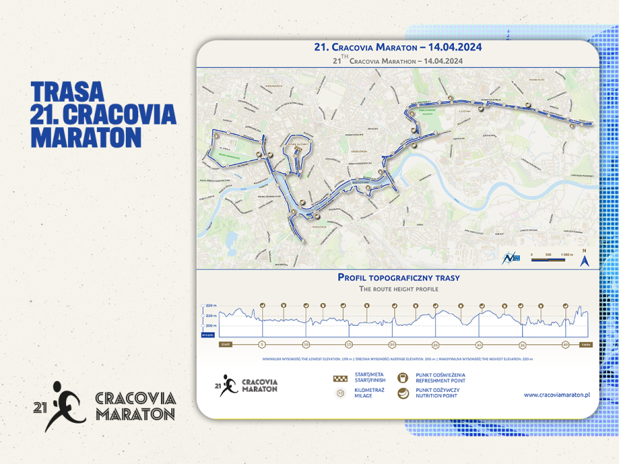 Przedstawiamy trasę 21. Cracovia Maratonu, który odbędzie się 14 kwietnia. Po raz kolejny rywalizacja odbędzie się na jednej pętli, a maratończycy zawitają do Nowej Huty. Jak ma to miejsce od 2014 roku, start i meta usytuowane będą w samym sercu Krakowa – na Rynku Głównym. Zgodnie z hasłem imprezy: „z historią w tle”, uczestnicy maratonu przebiegną obok wielu wspaniałych zabytków stolicy Małopolski. Po drodze nie zabraknie też przykładów nowoczesnej architektury i pięknej przyrody.