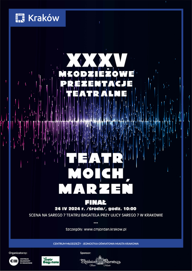 Dziś o godz. 10.00 na Scenie przy Sarego Teatru Bagatela rozpocznie się finał 35. Młodzieżowych Prezentacji Teatralnych „Teatr Moich Marzeń”, organizowanych przez Centrum Młodzieży im. dr. H. Jordana. Podczas finału zostanie ogłoszony werdykt jury, a laureaci odbiorą nagrody i zaprezentują najlepsze spektakle tegorocznej edycji przeglądu.