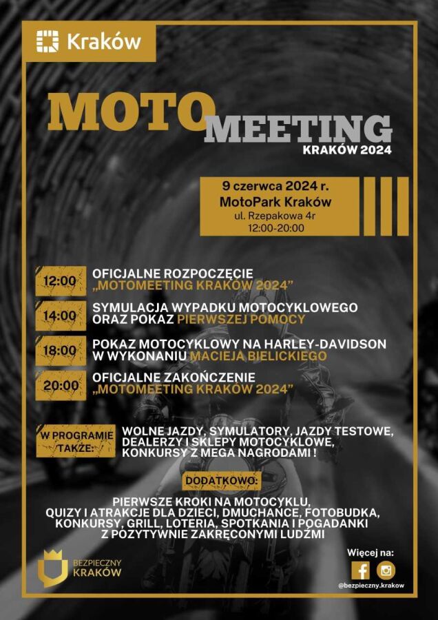 Urząd Miasta Krakowa zaprasza wszystkich mieszkańców Krakowa dziś, w godz. 12.00–20.00 na trzecią edycję „MotoMeeting Kraków 2024”, organizowanego w ramach programu „Bezpieczny Kraków”.