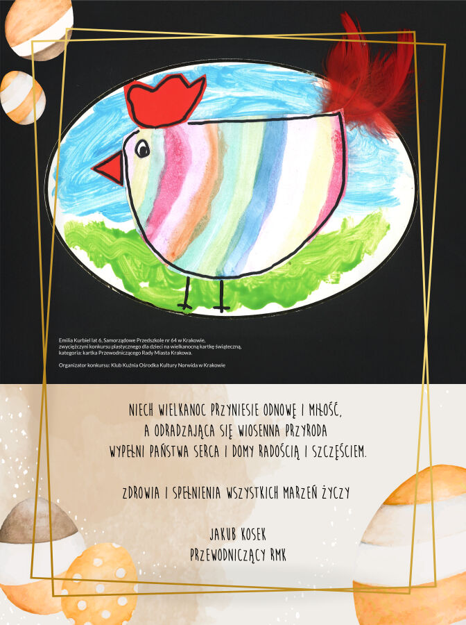 W tym roku świąteczna kartka Przewodniczącego RMK ma wyjątkowy charakter – jej autorką jest sześcioletnia Emilia Kurbiel z Samorządowego Przedszkola nr 64, laureatka konkursu na najpiękniejszą kartkę wielkanocną, organizowanego przez Klub Kuźnia Ośrodka Kultury Norwida w Krakowie. Zwycięski rysunek Emilii, przedstawiający uroczego, pasiastego kurczaczka zachwycił jury swoją radością, kolorem i dziecięcą wyobraźnią. O konkursie przeczytacie na stronie www.rmk.krakow.pl.