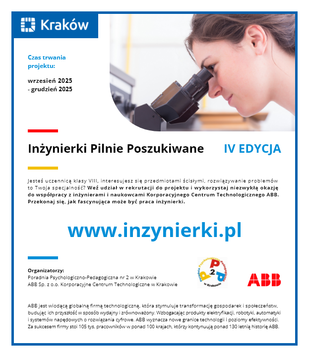 Jesteś uczennicą klasy VIII i interesujesz się matematyką, fizyką lub chemią? Poradnia Psychologiczno-Pedagogiczna nr 2 w Krakowie wraz z Korporacyjnym Centrum Badawczym ABB zapraszają do wzięcia udziału w projekcie „Inżynierki pilnie poszukiwane”, którego celem jest zachęcenie dziewcząt do rozwijania zainteresowań naukami ścisłymi, a także przybliżenie im świata inżynierii i nowoczesnych technologii.