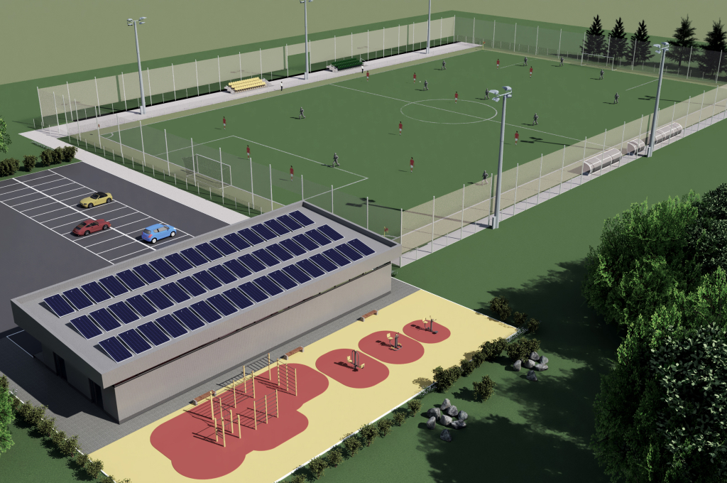 Wokół boiska powstaną piłkochwyty o wysokości 6 m, a kibice będą mogli korzystać z widowni na maksymalnie 100 miejsc (dwie trzyrzędowe trybuny po ok. 50 osób każda). - budynek zaplecza szatniowo-socjalnego