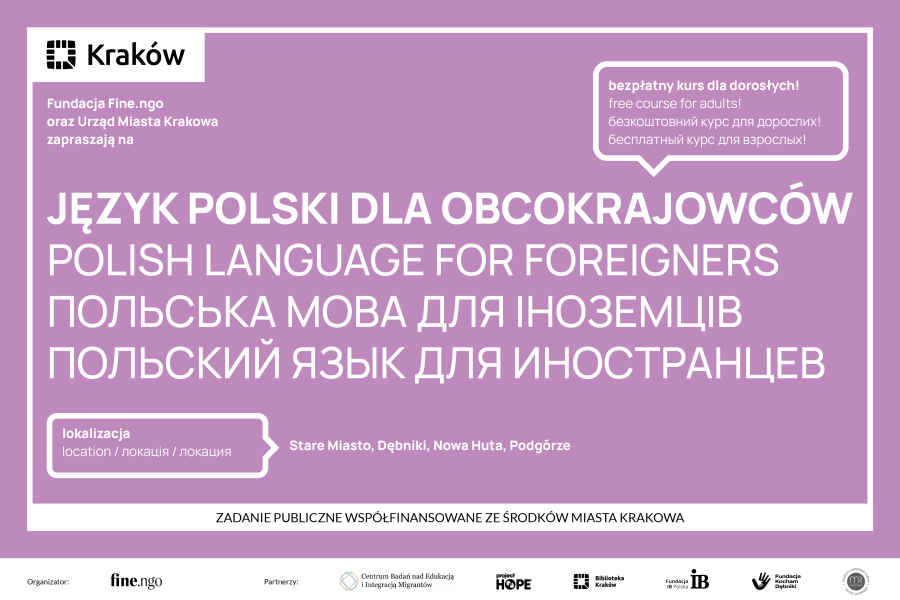 Fundacja FINE wraz z Urzędem Miasta Krakowa, w odpowiedzi na ogromne zainteresowanie i zapotrzebowanie, ogłasza rekrutację do nowej, trzeciej już edycji bezpłatnych, intensywnych kursów języka polskiego jako obcego dla pełnoletnich mieszkańców Krakowa.