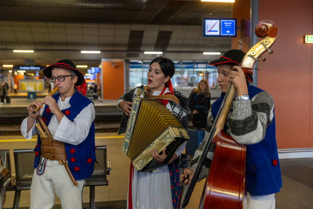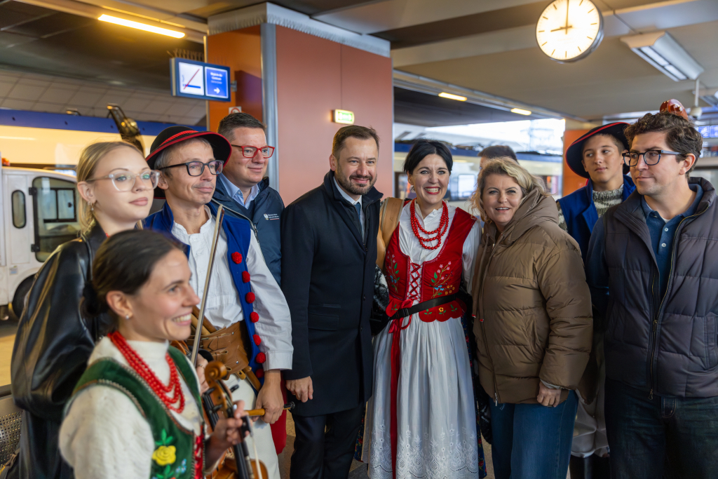 Pociągiem do Krakowa przyjechali m.in. podsekretarze stanu w Ministerstwie Infrastruktury Przemysław Koperski i Piotr Malepszak. Przygrywała kapela z Zespołu Pieśni i Tańca „Ziemia Beskidzka” z Mesznej.