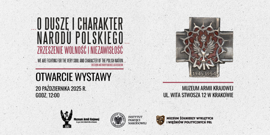 Dziś, 20 października o godz. 12.00 w Muzeum Armii Krajowej w Krakowie odbędzie się otwarcie nowej wystawy czasowej zatytułowanej „O duszę i charakter Narodu Polskiego. Zrzeszenie Wolność i Niezawisłość”. Ekspozycja powstała z okazji przypadającej w tym roku 80. rocznicy powołania WiN-u.