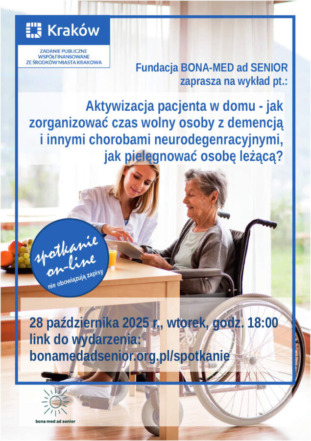 Wszystkie osoby opiekujące się osobami starszymi zapraszamy do wzięcia udziału w wykładzie online pt.: „Aktywizacja pacjenta w domu – jak zorganizować czas wolny osoby z demencją i chorobami neurodegeneracyjnymi. Jak pielęgnować osobę leżącą”, który odbędzie się dziś, 28 października o godz. 18.00.
