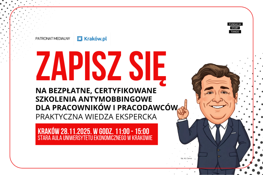 28 listopada w godz. 11.00–15.00 w Starej Auli Uniwersytetu Ekonomicznego w Krakowie odbędą się bezpłatne, certyfikowane szkolenia antymobbingowe dla pracowników, pracodawców, kadry zarządzającej oraz mieszkańców Małopolski. O uczestnictwie decyduje kolejność zgłoszeń.