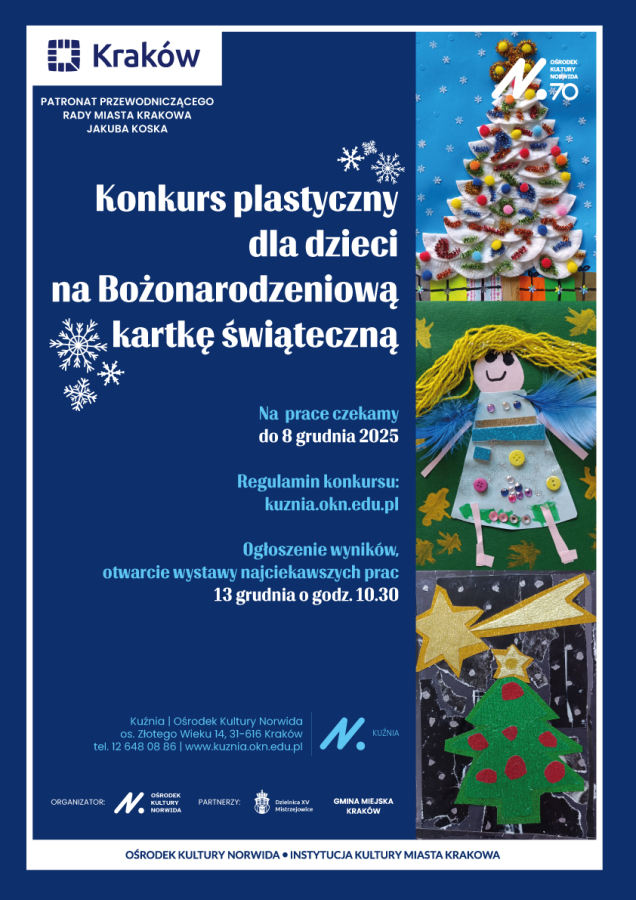 Magia świąt Bożego Narodzenia znów może ożyć dzięki wyobraźni najmłodszych! Organizatorzy zapraszają dzieci do 12. roku życia oraz grupy z przedszkoli, szkół, klubów i domów kultury do udziału w wyjątkowym konkursie, którego zwycięska praca zyska niezwykłą rangę – stanie się oficjalną kartką świąteczną Przewodniczącego Rady Miasta Krakowa. To niecodzienna szansa dla młodego artysty – jego dzieło trafi do setek adresatów, niosąc świąteczne przesłanie w imieniu krakowskich władz samorządowych. Konkurs organizowany jest przez Klub Kuźnia Ośrodka Kultury Norwida w partnerstwie z Dzielnicą XV Mistrzejowice oraz Gminą Miejską Kraków. Druga edycja akcji „Kartka Przewodniczącego Rady Miasta Krakowa” to kontynuacja wielkanocnego sukcesu, który przyniósł setki pięknych, pełnych dziecięcej wyobraźni prac.