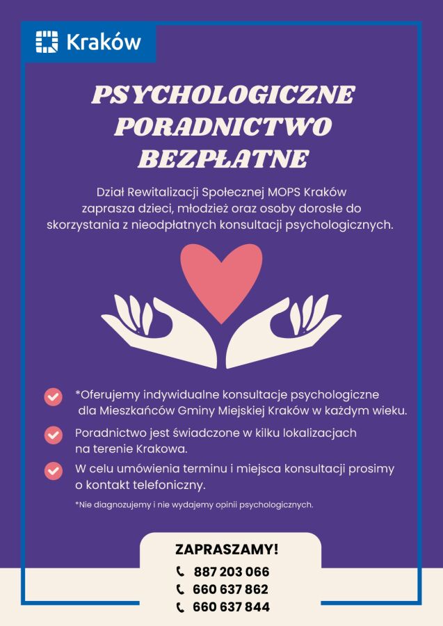Dział Rewitalizacji Społecznej MOPS w Krakowie informuje, że dzieci, młodzież oraz osoby dorosłe mogą skorzystać z nieodpłatnego wsparcia psychologicznego.