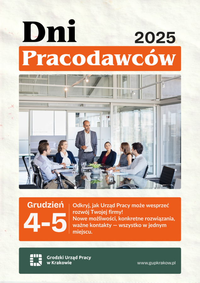 Grodzki Urząd Pracy w Krakowie zaprasza wszystkich pracodawców do udziału w tegorocznych Dniach Pracodawców, które odbywają się w dniach 4–5 grudnia. Wydarzenie to wyjątkowa okazja, aby poznać możliwości wsparcia oferowanego przez urząd pracy, dowiedzieć się, jak skutecznie pozyskiwać kandydatów, rozwijać kompetencje pracowników i korzystać z dostępnych instrumentów finansowych.