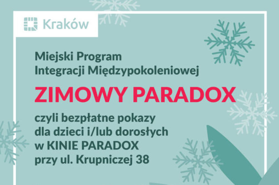Centrum Młodzieży im. dr. H. Jordana oraz kino studyjne Paradox zapraszają dzieci, młodzież, dorosłych i seniorów na drugą edycję cyklu Zimowy Paradox. W grudniu w kinie przy ul. Krupniczej 38 odbędą się bezpłatne, niedzielne pokazy filmowe z dodatkowymi atrakcjami oraz jeden wyjątkowy seans w piątek – wszystko w ramach Miejskiego Programu Integracji Międzypokoleniowej.