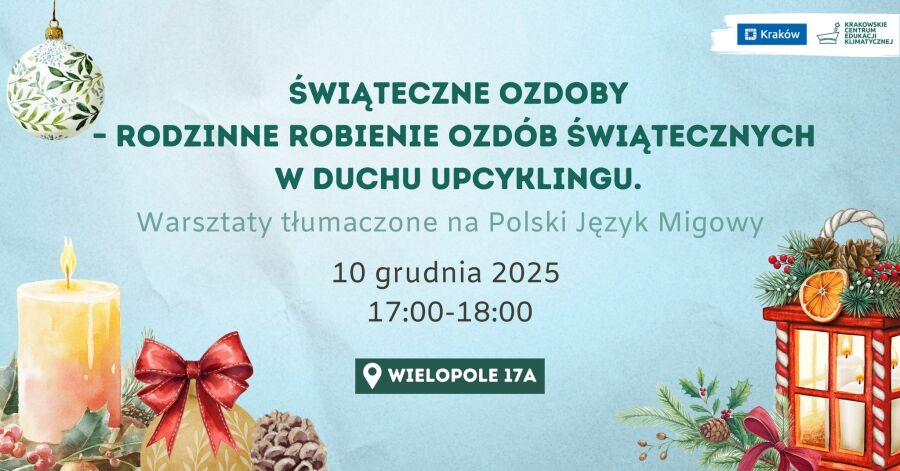 Już jutro, 10 grudnia o godz. 17.00, w Krakowskim Centrum Edukacji Klimatycznej przy ul. Wielopole 17a odbędą się rodzinne warsztaty upcyklingowe „Świąteczne ozdoby”. Zajęcia będą okazją, aby twórczo spędzić popołudnie i przekonać się, że zero waste może być nie tylko ekologiczne, ale też inspirujące. Warsztaty będą tłumaczone na Polski Język Migowy.