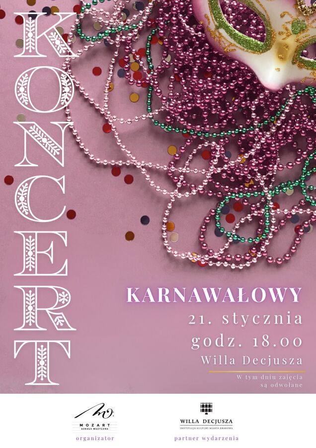 Już w środę, 21 stycznia o godz. 18.00 w zabytkowych wnętrzach Willi Decjusza odbędzie się Koncert Karnawałowy Szkoły Muzycznej Mozart, na który zaprasza Instytut Kultury Willa Decjusza.